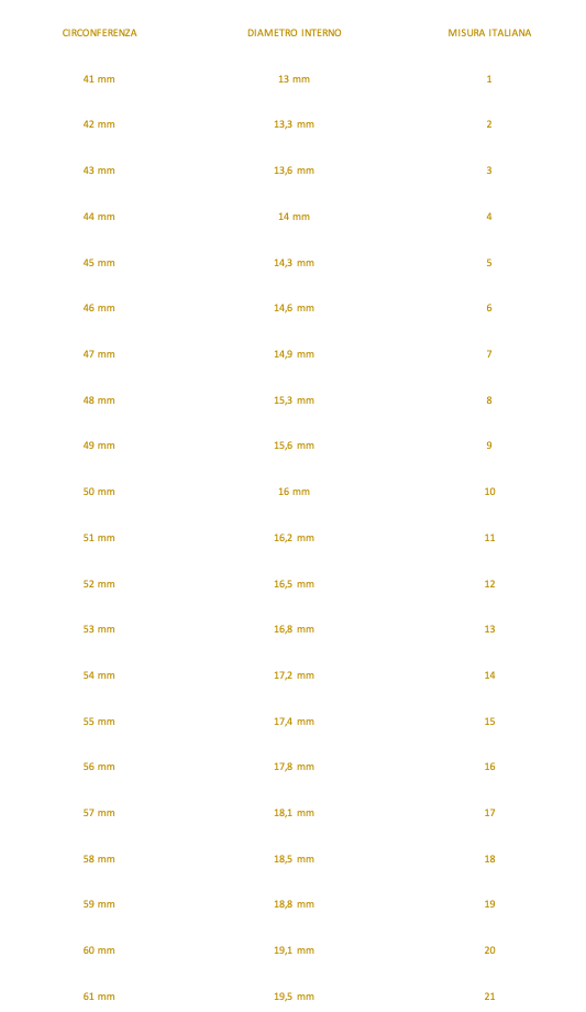 -con un righello misurate il diametro interno del vostro anello nella parte più larga del gambo o la circonferenza interna con un metro morbido , fate sempre molta attenzione anche ai millimetri. Tra una taglia e l’altra ci possono essere delle differenze infinitesimali.