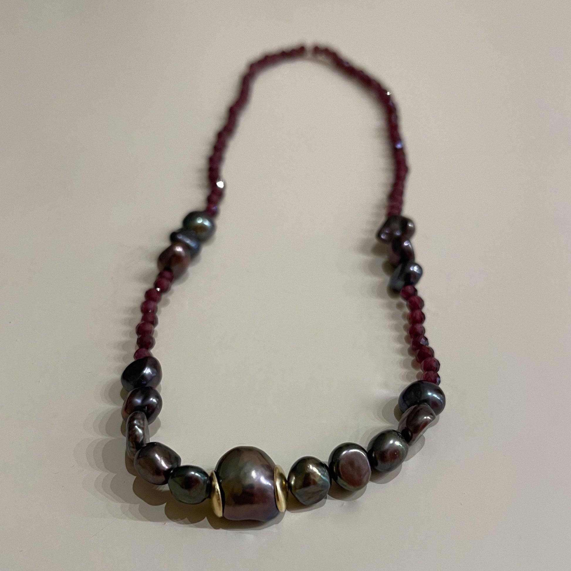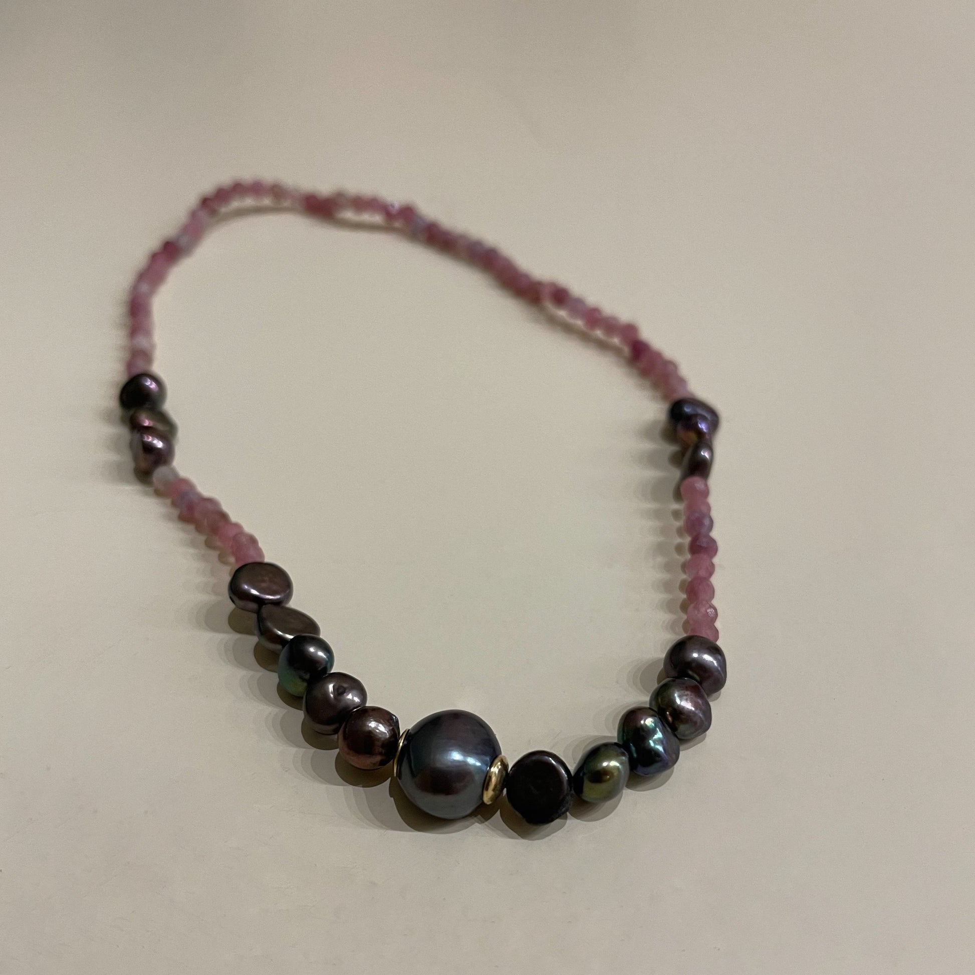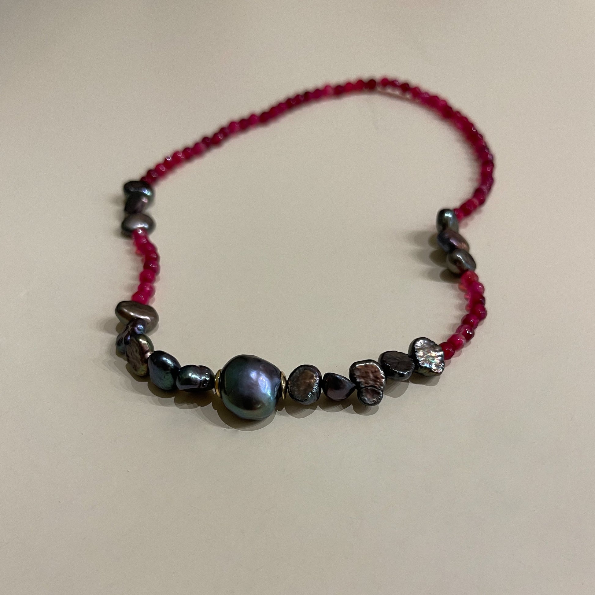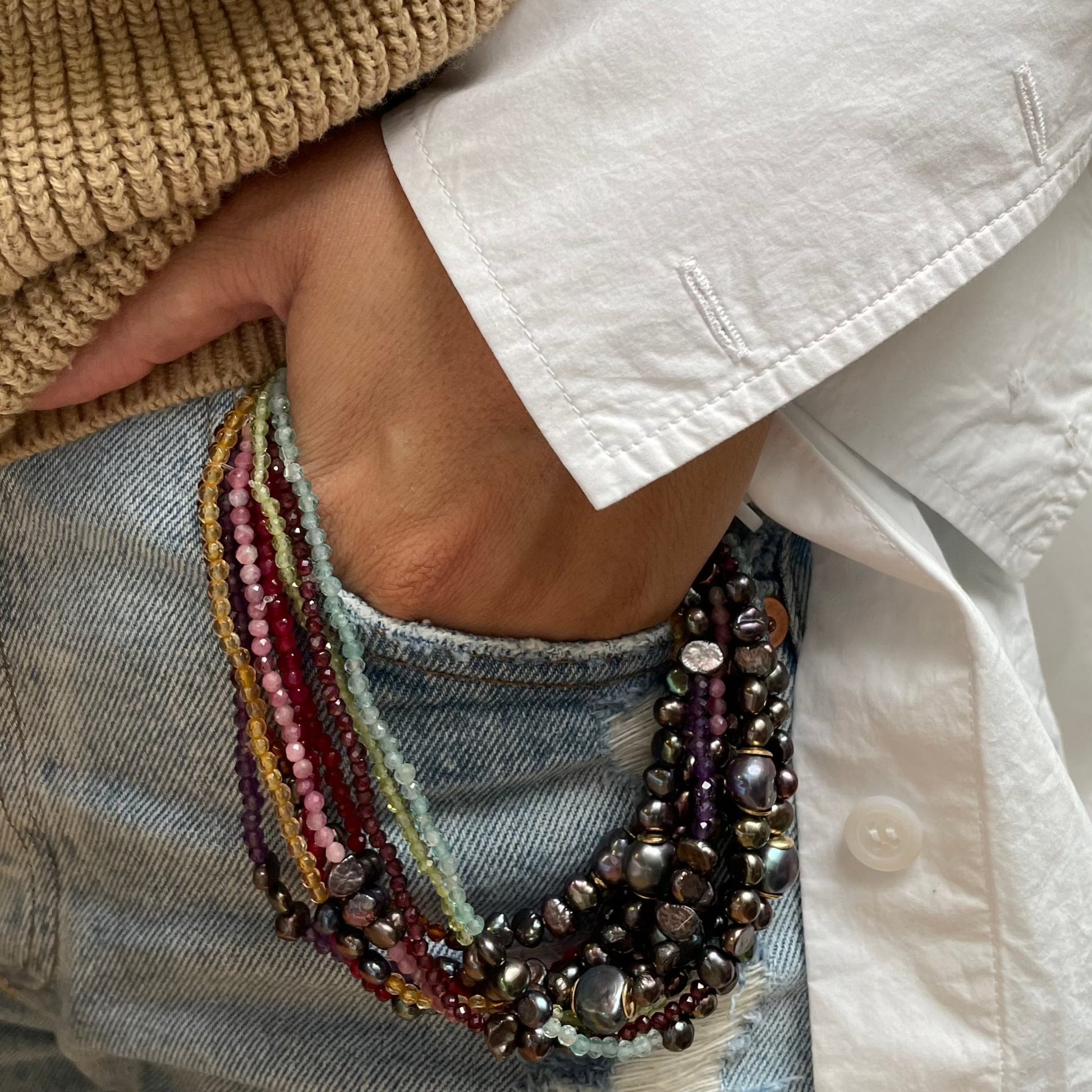 Choker elastico con perle, pietre dure e centrale in oro 18kt.