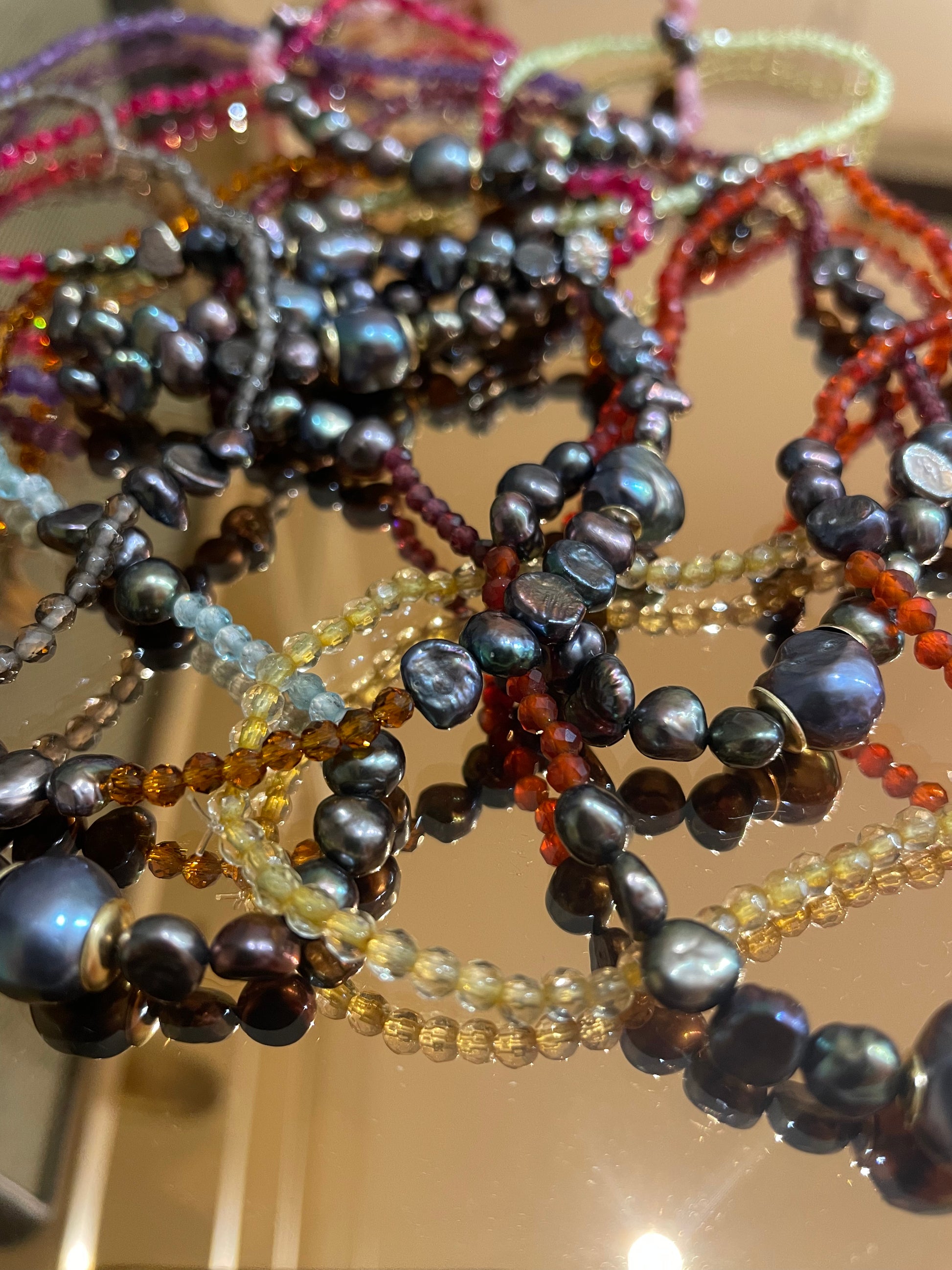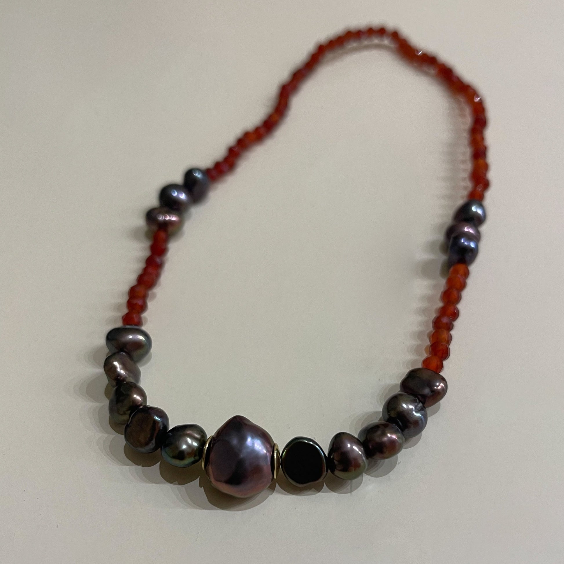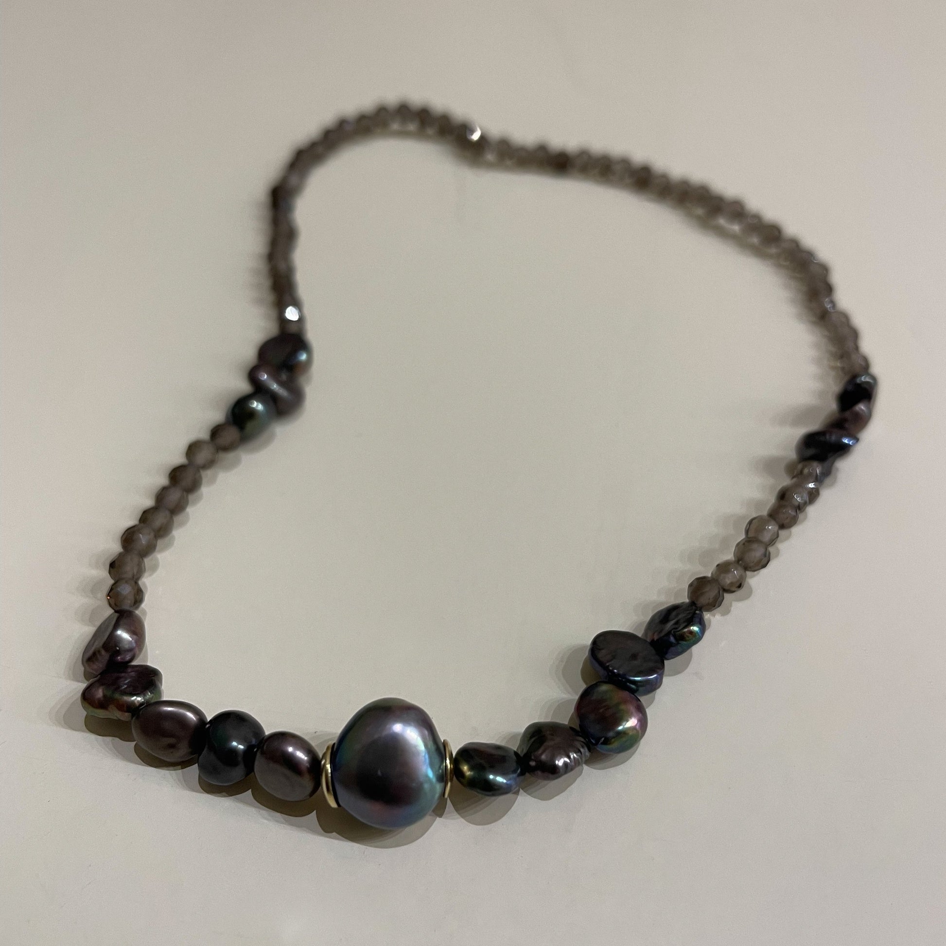 Choker elastico con perle, pietre dure e centrale in oro 18kt.