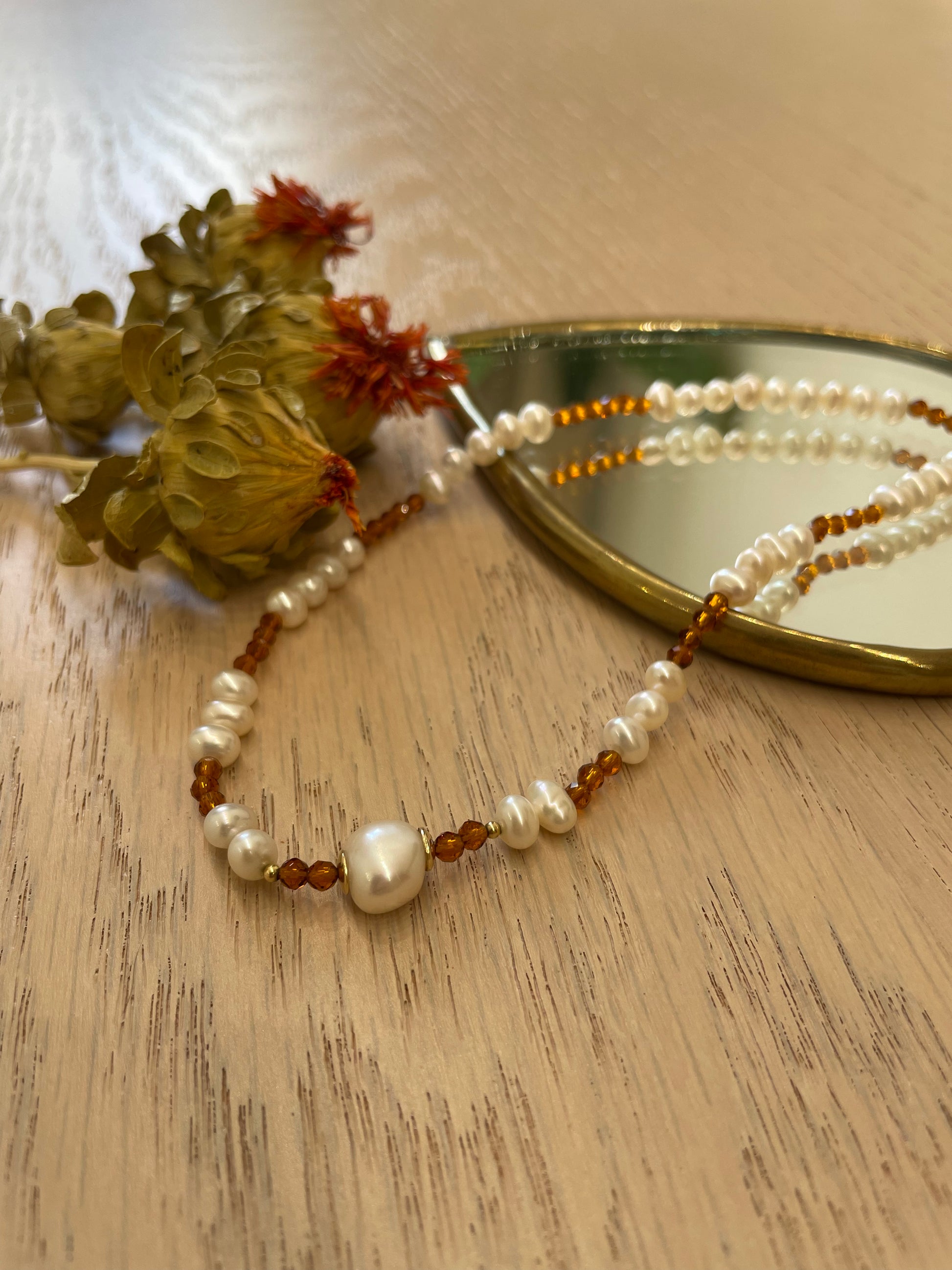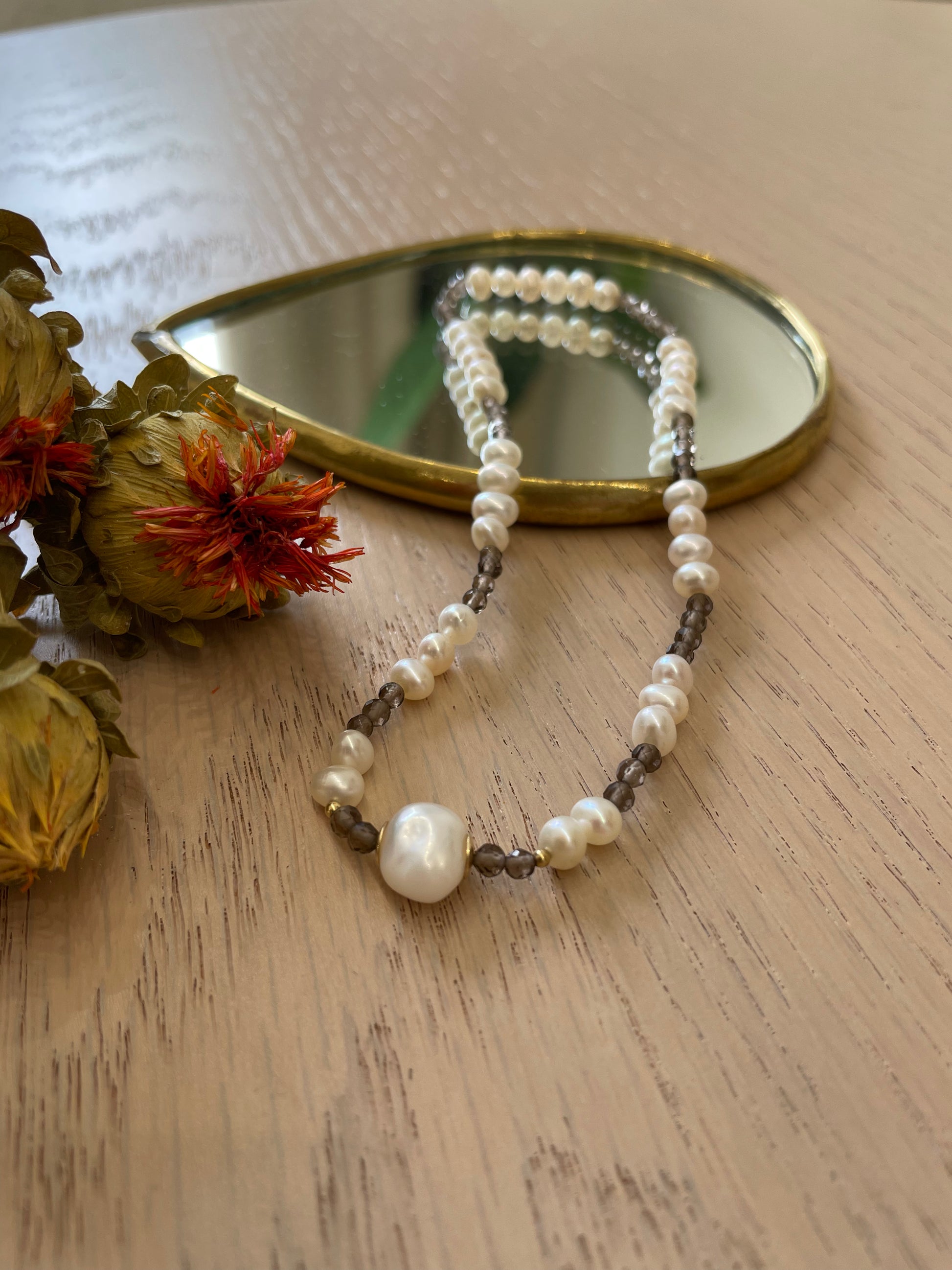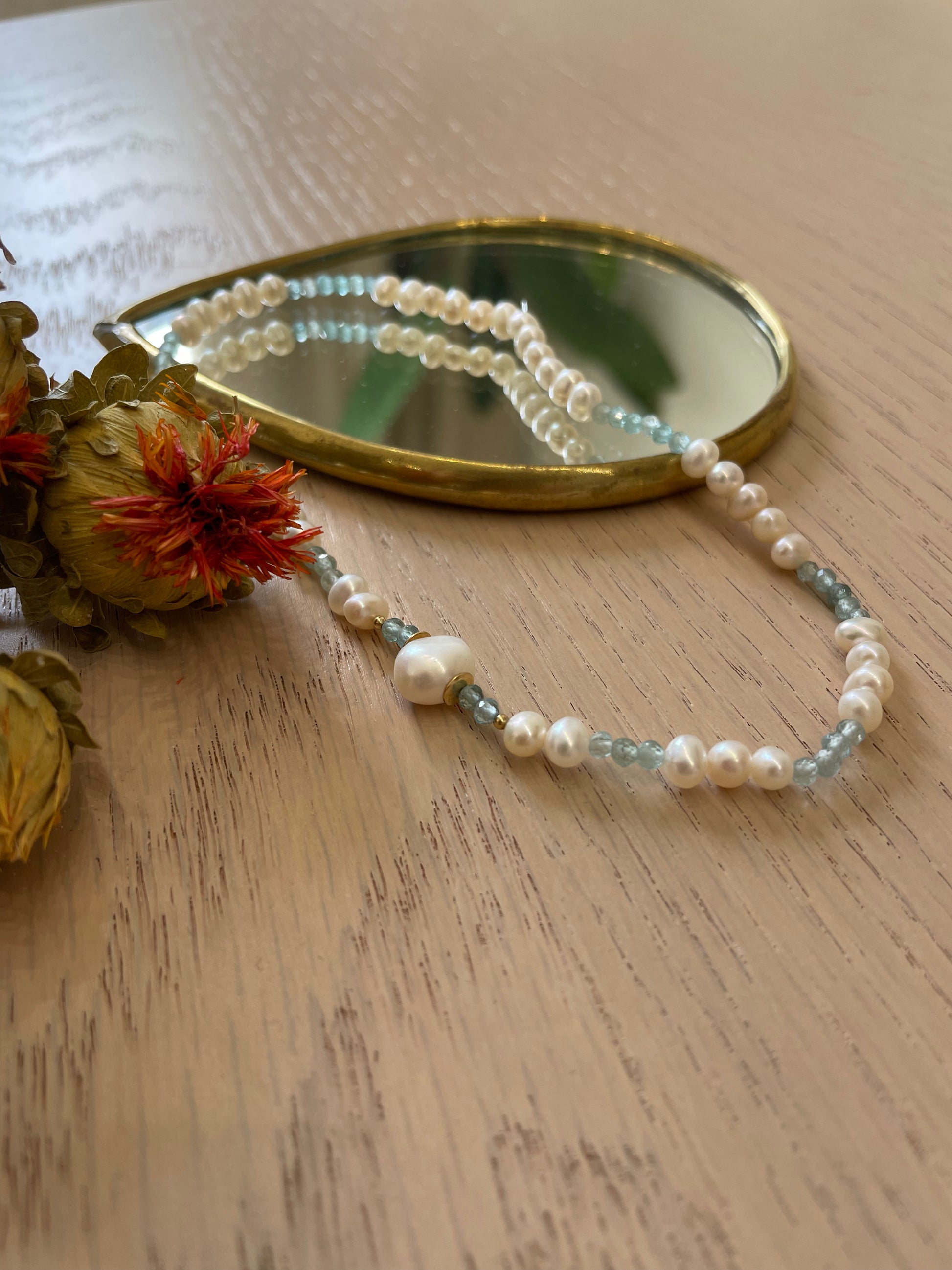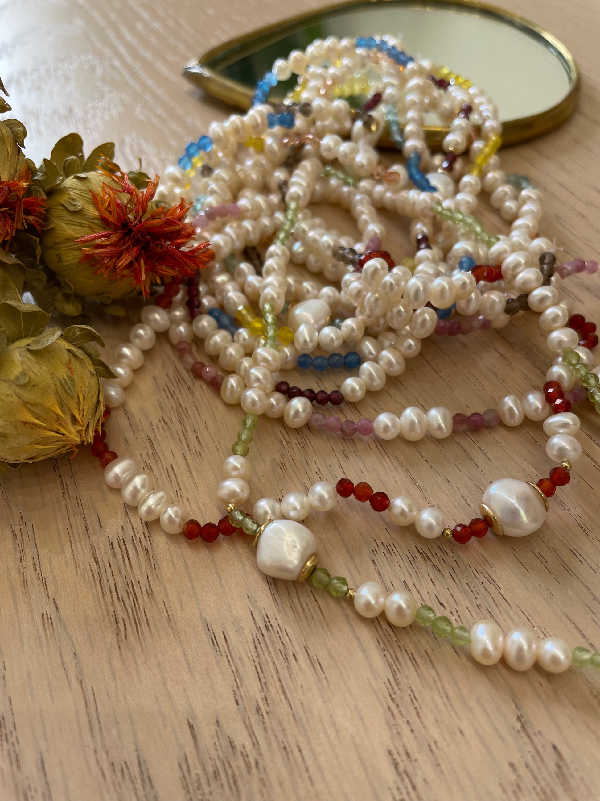 Choker elastico con perle, pietre dure e centrale in oro 18kt.