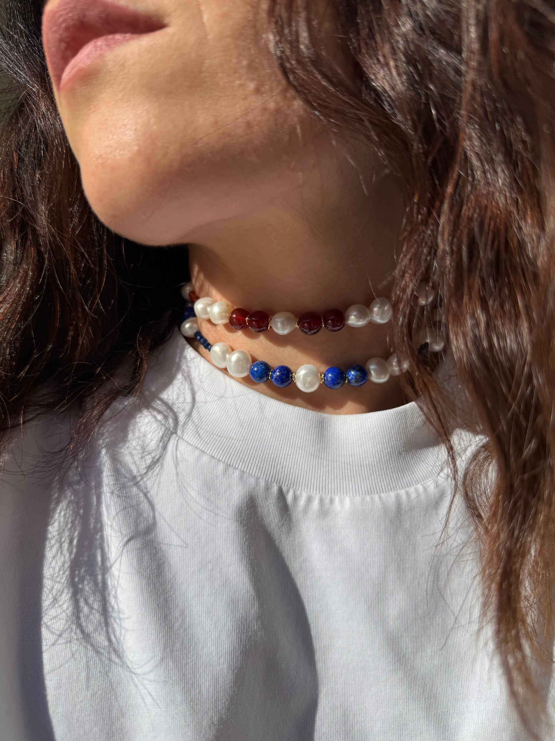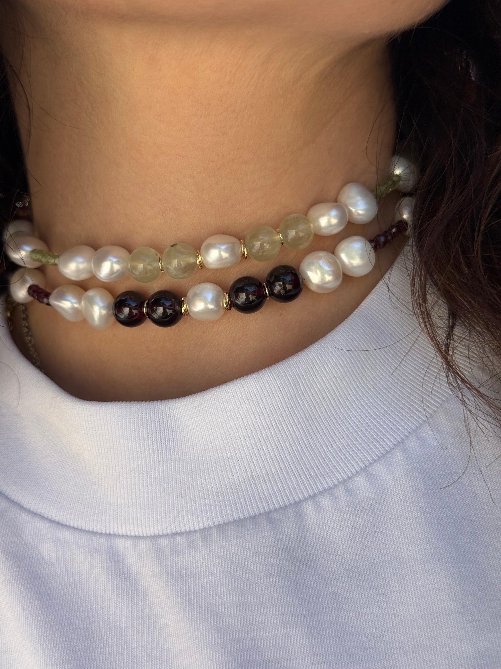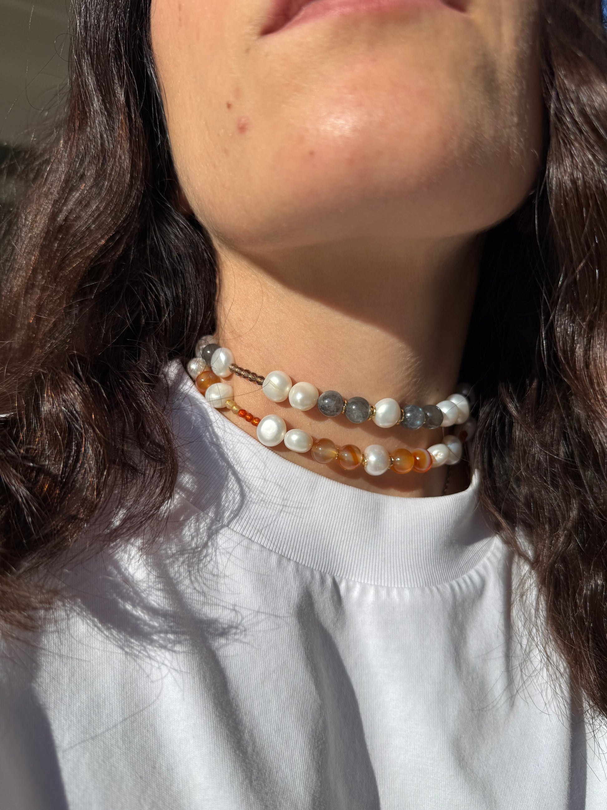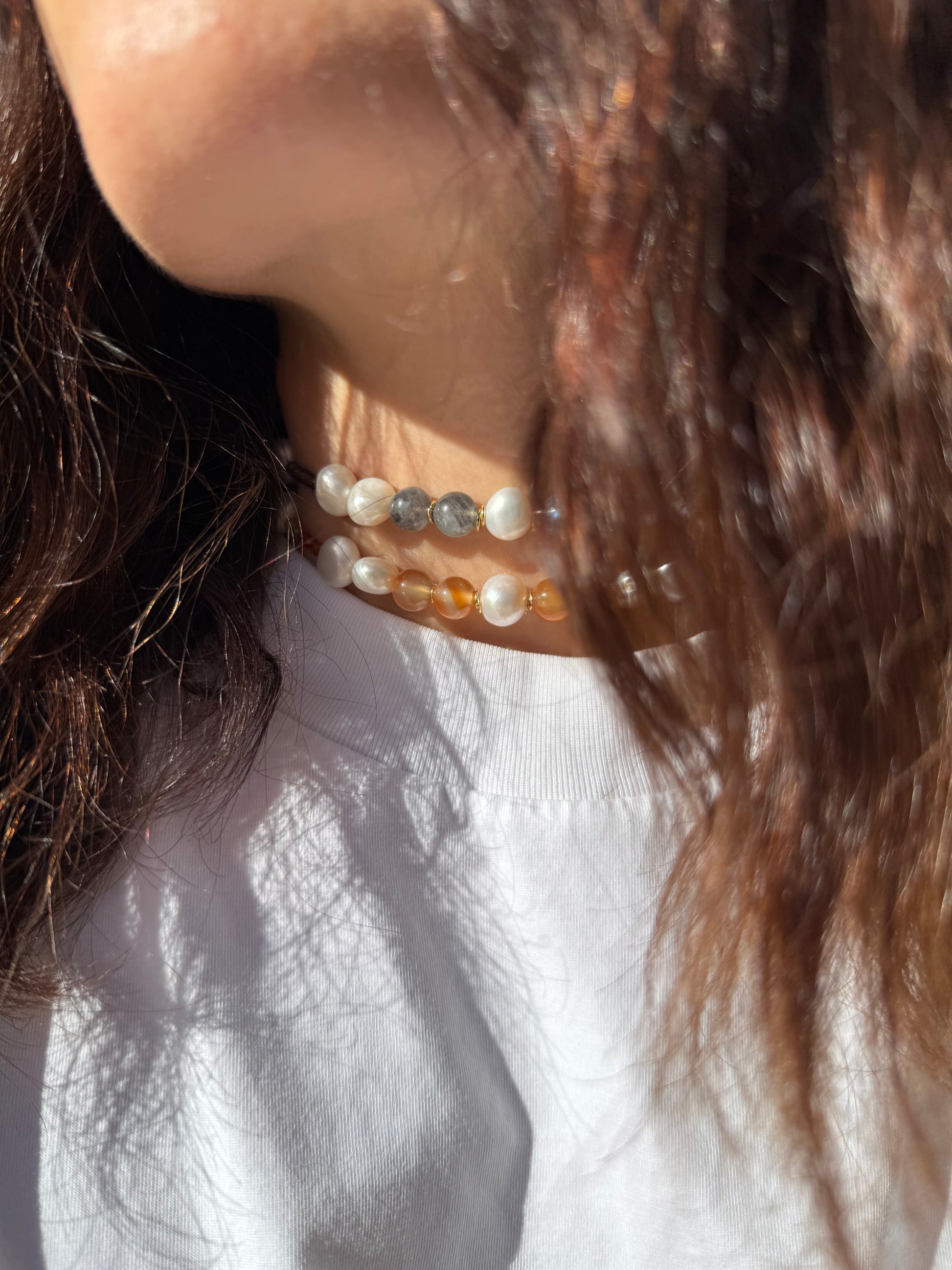 Choker rigido con filo armonico in acciaio placcato oro composto di perle, pietre dure e dettagli in oro 18kt.