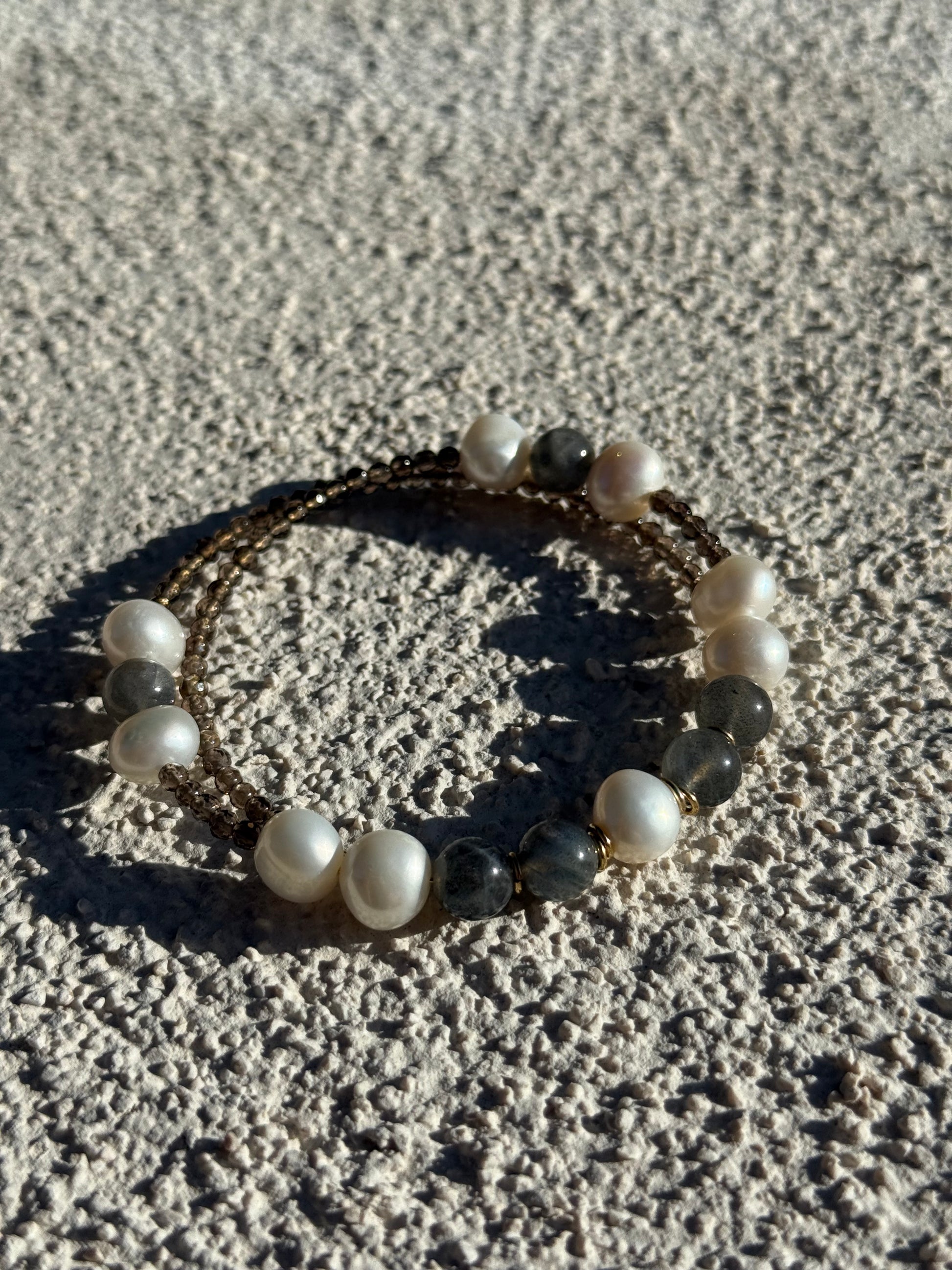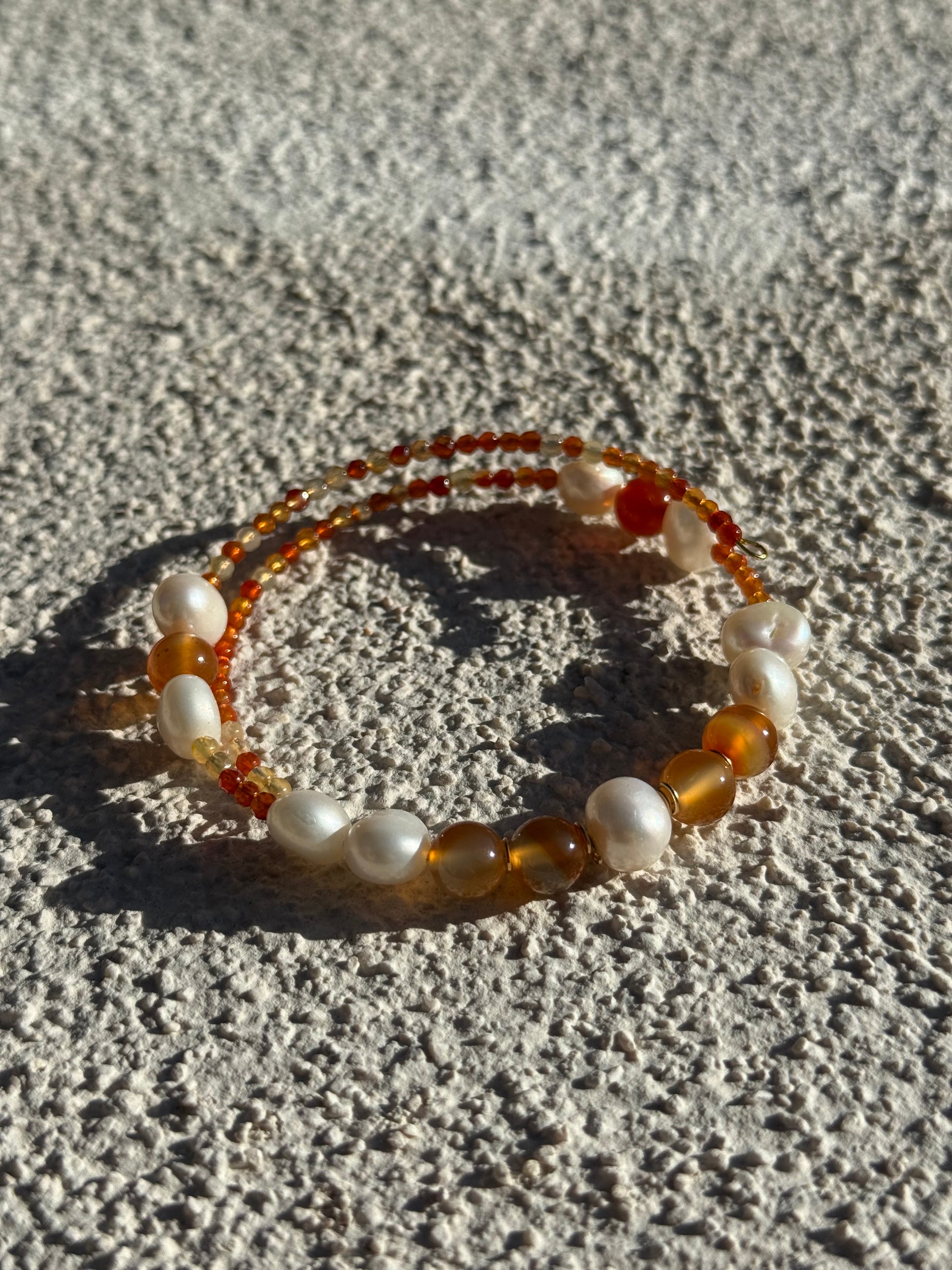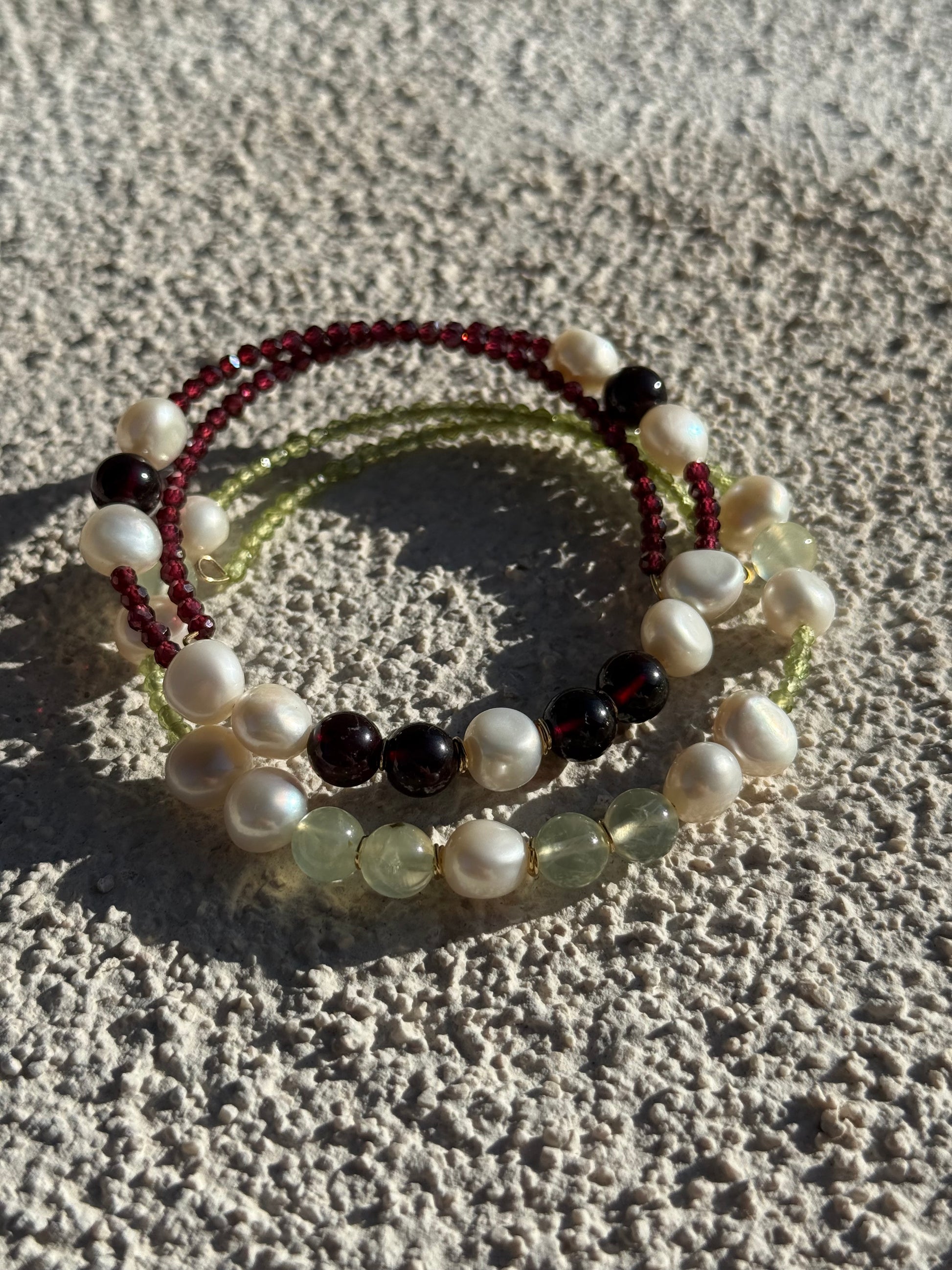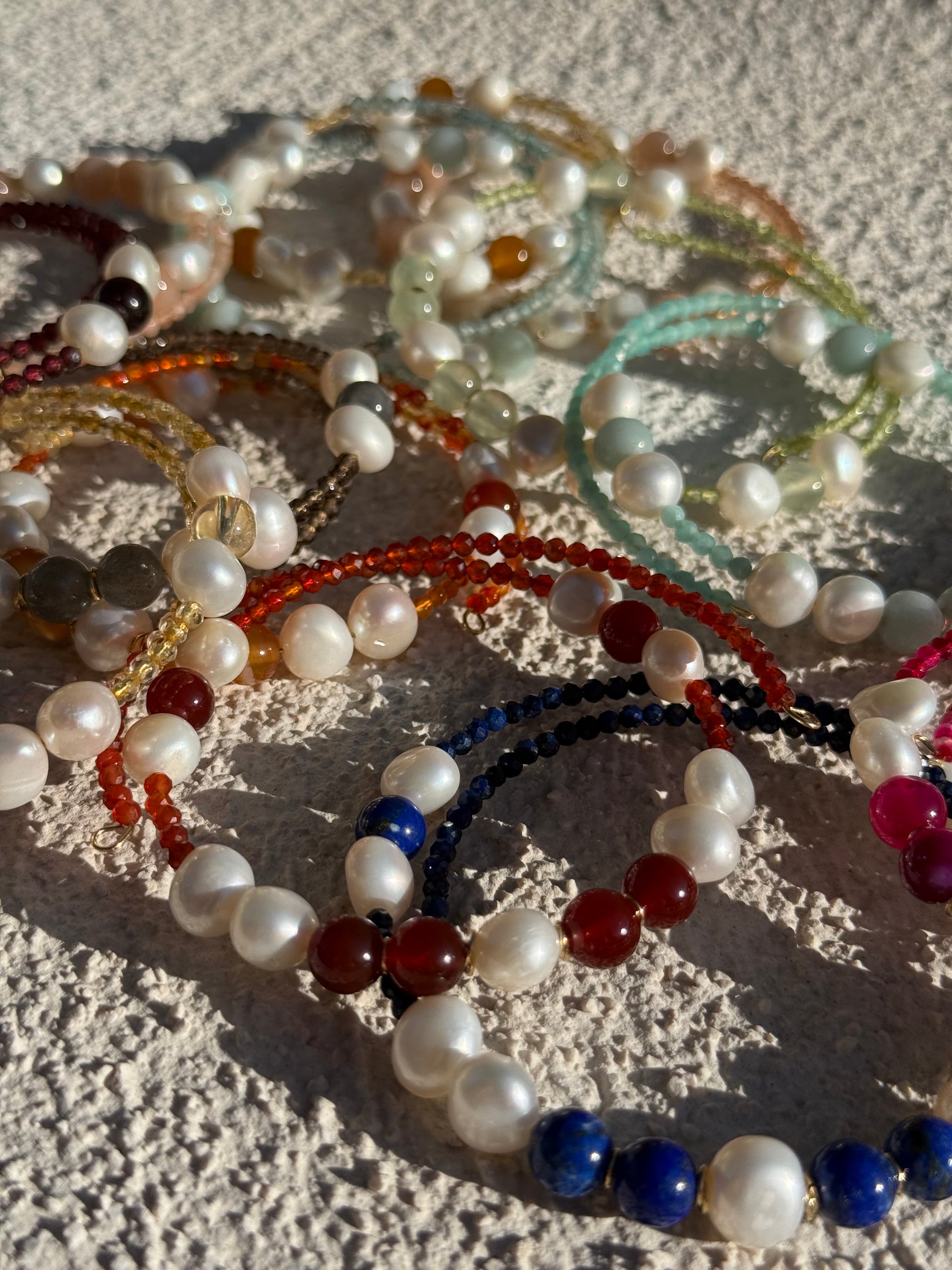 Choker rigido con filo armonico in acciaio placcato oro composto di perle, pietre dure e dettagli in oro 18kt.