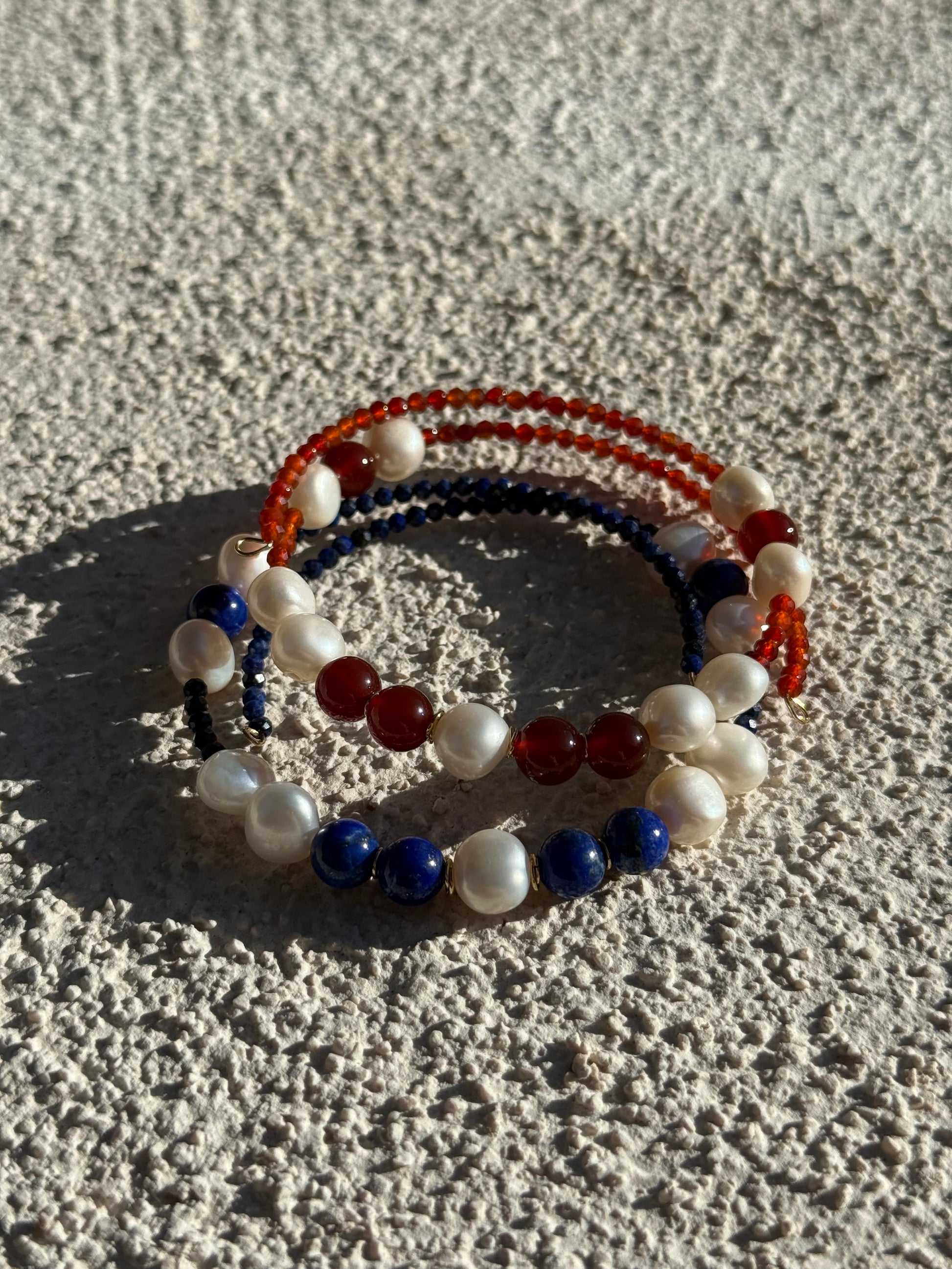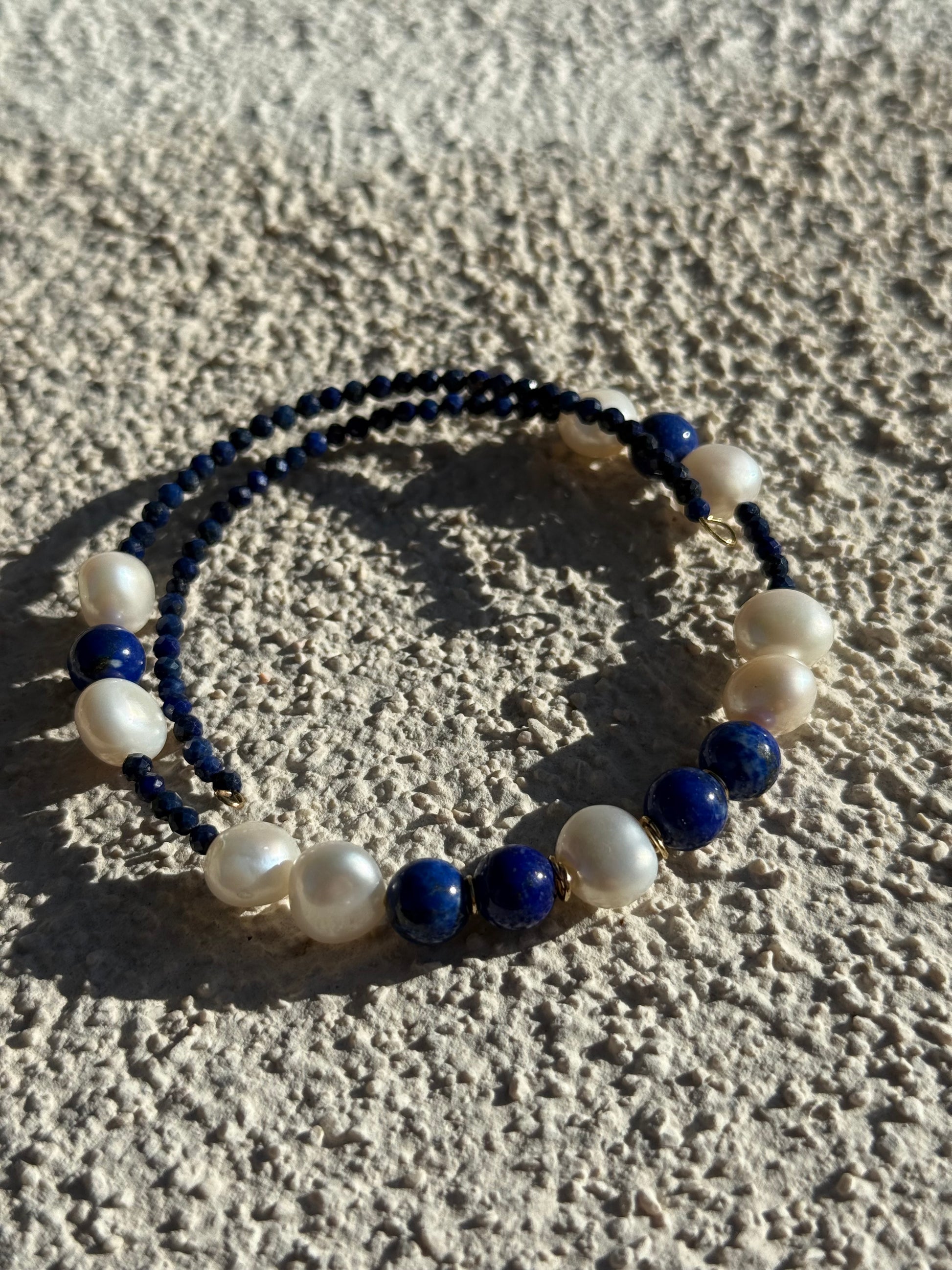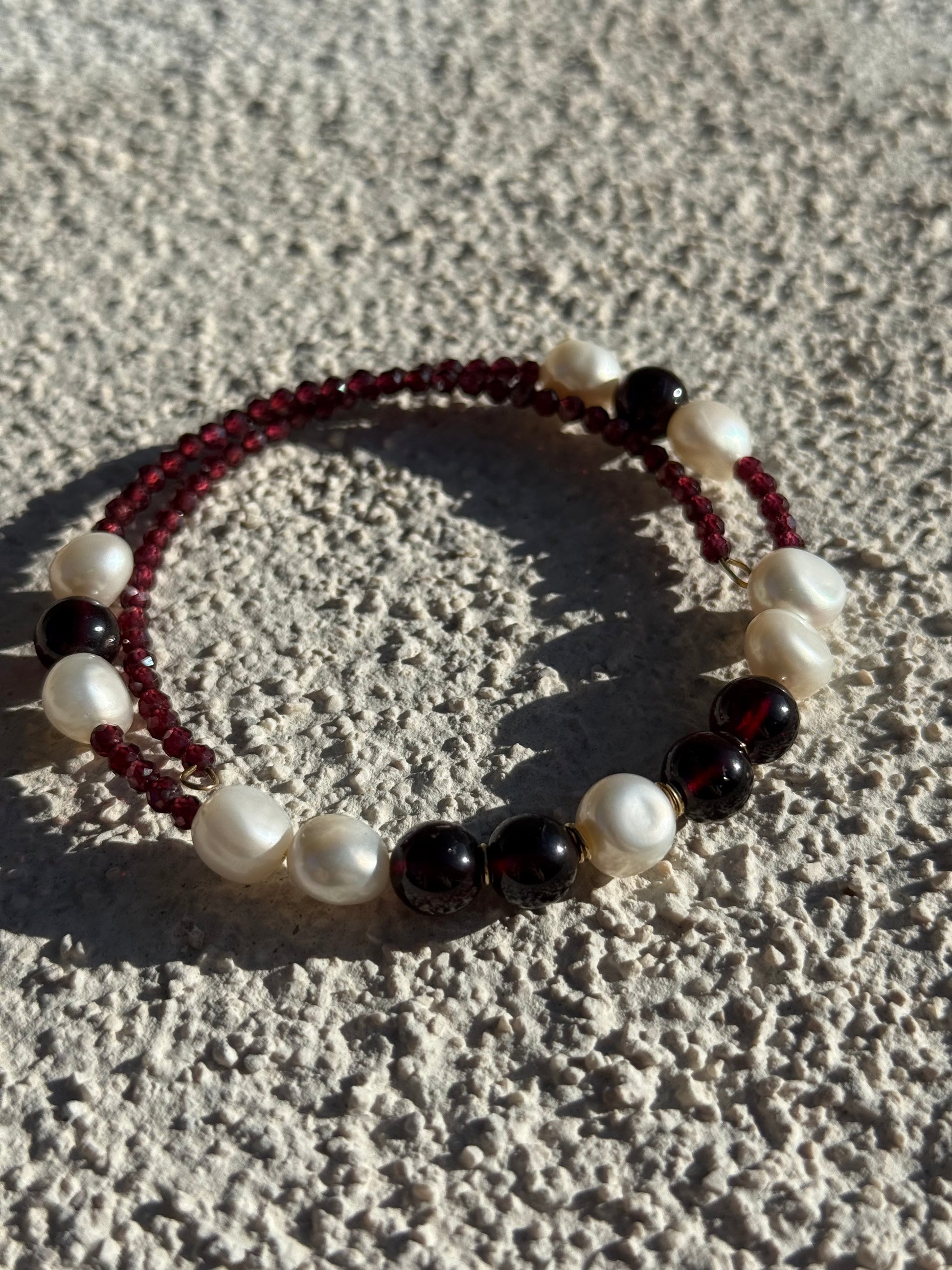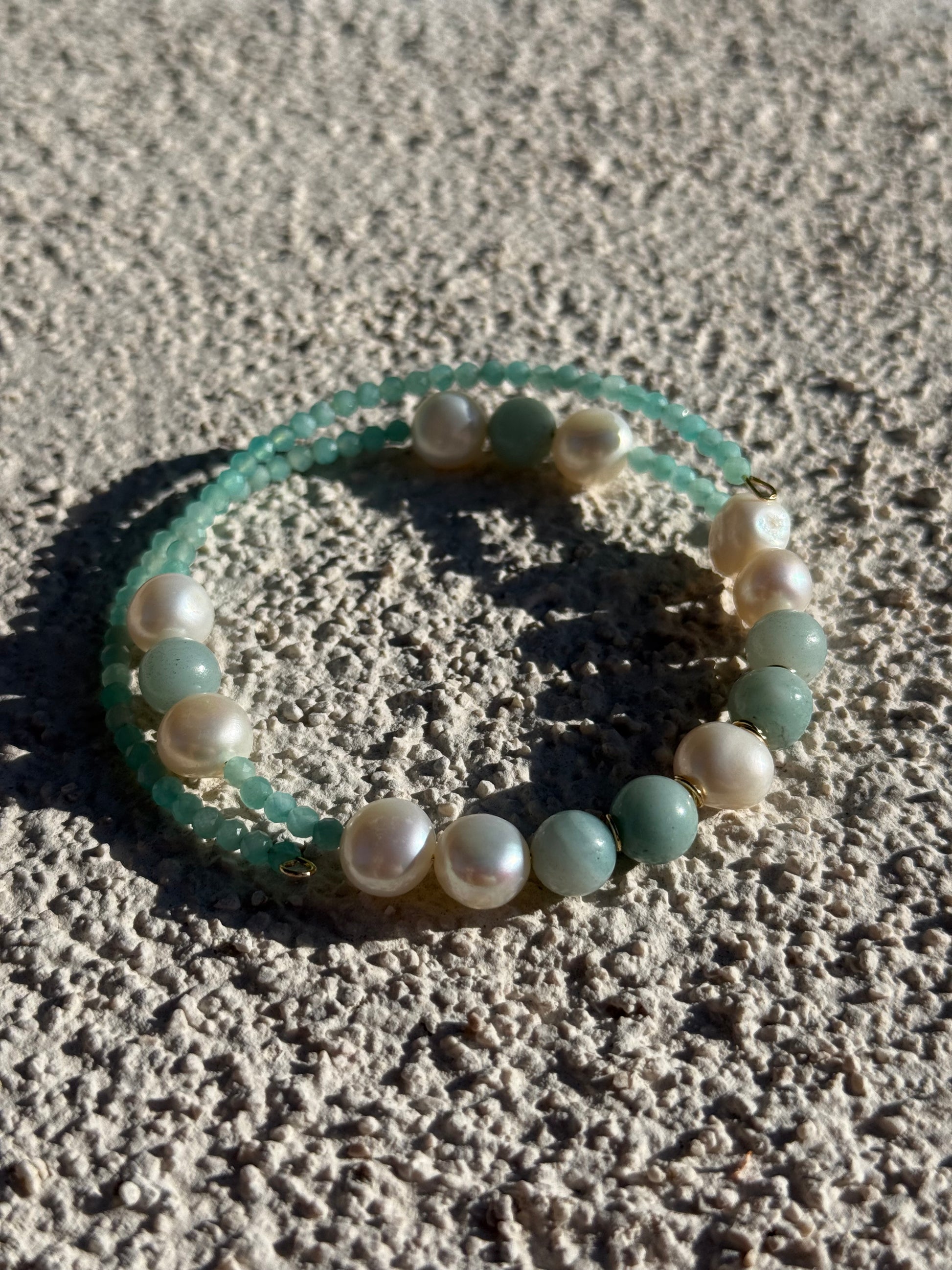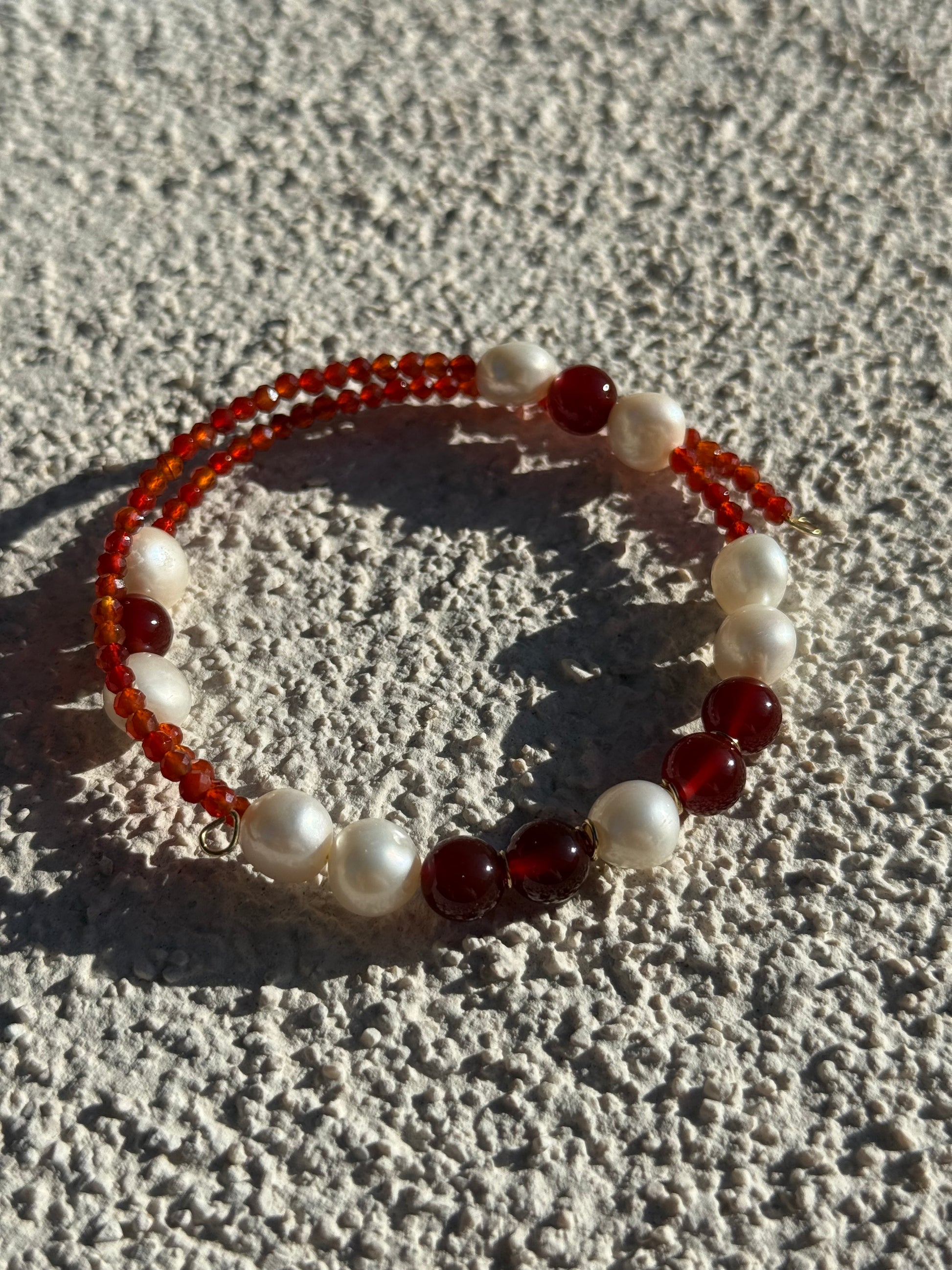 Choker rigido con filo armonico in acciaio placcato oro composto di perle, pietre dure e dettagli in oro 18kt.