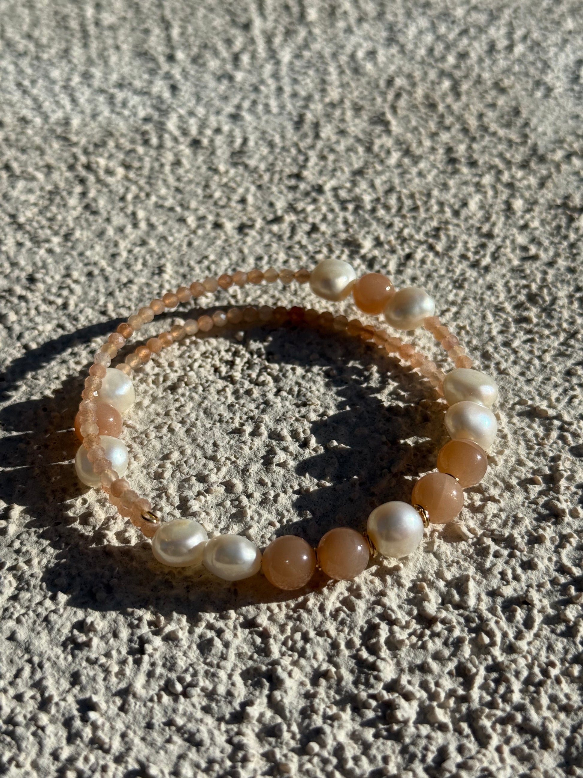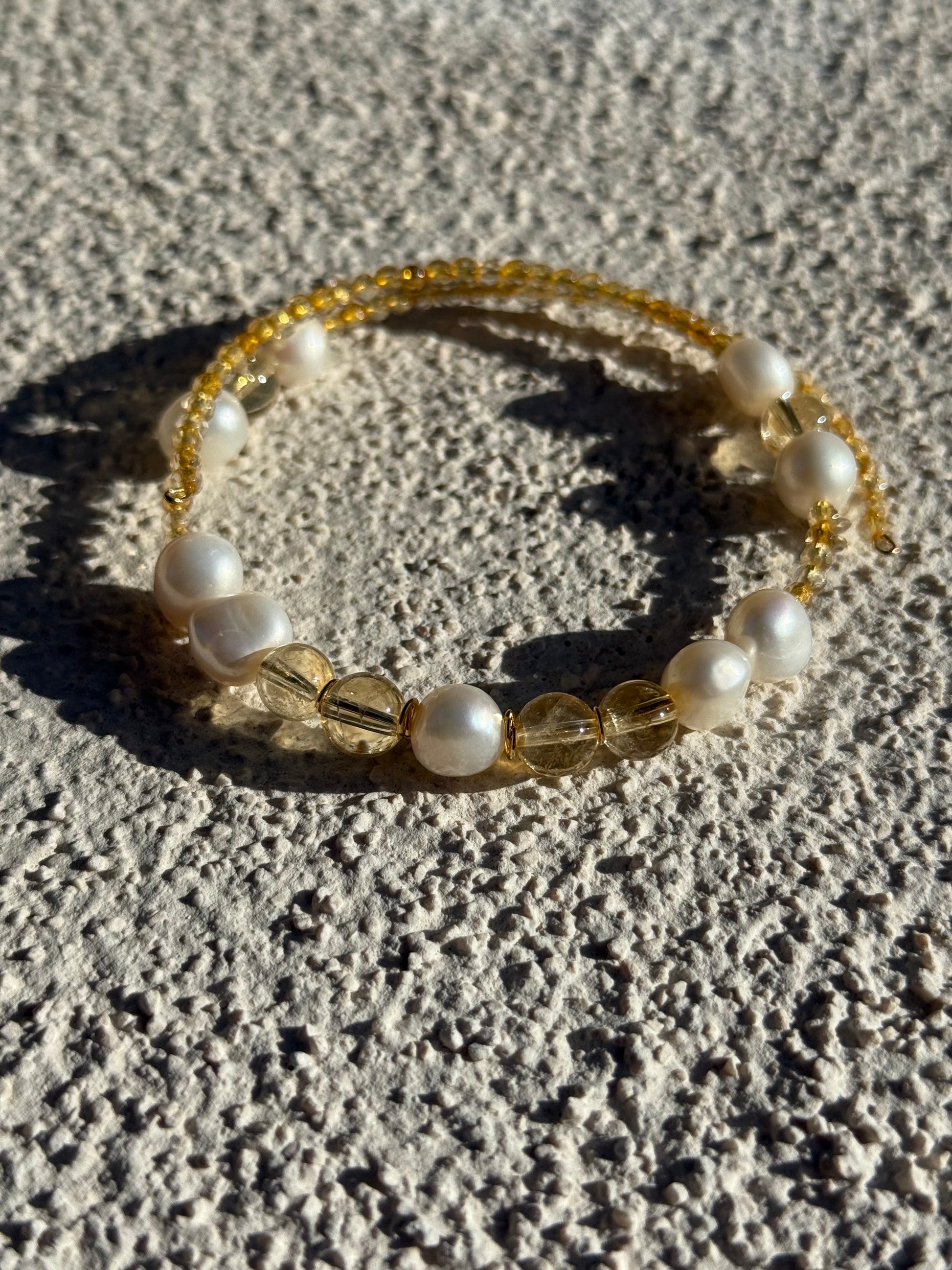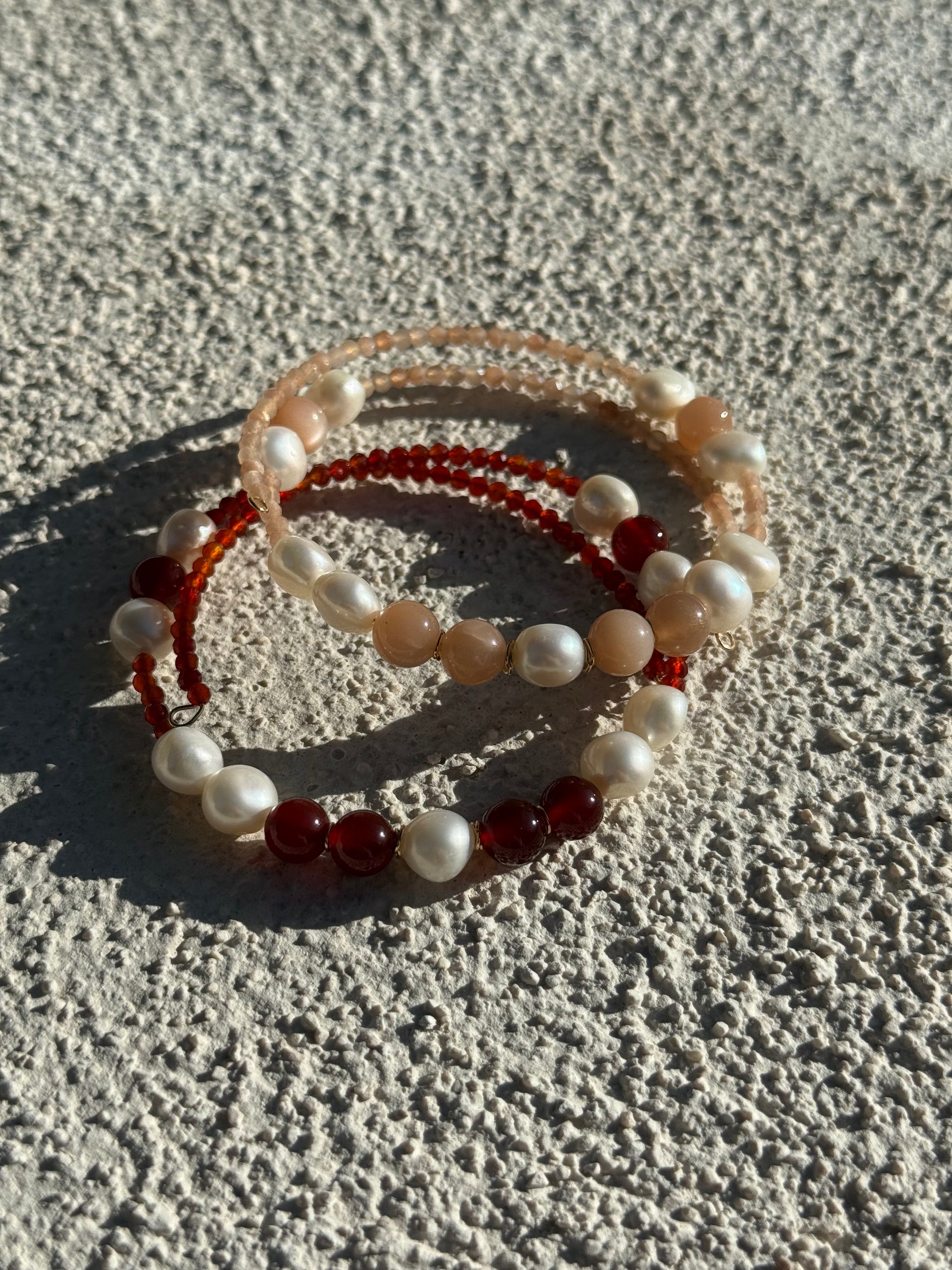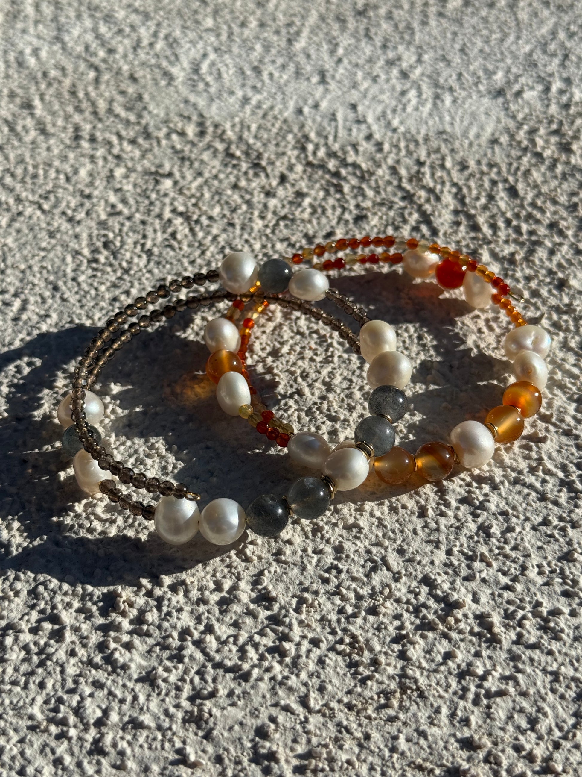 Choker rigido con filo armonico in acciaio placcato oro composto di perle, pietre dure e dettagli in oro 18kt.